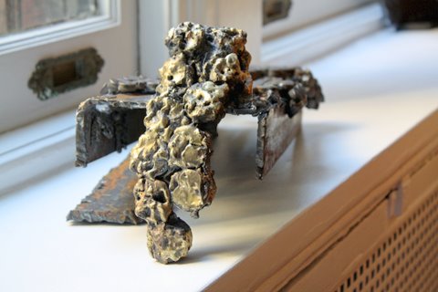 The base of this sculpture, which is on an area of 2' x 2' square demonstrates the harmonious relationship between the coral, the reef and the fish. The coral and reef elements are movable. In this way the viewer can change the relationships. (...)