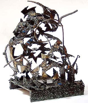 The pinnacles are made primarily of steel, and range in height from 20 inches to 40 inches. The early pinnacles in this series are darker and denser to give the feeling of the awesome size and power of this natural phenomenon. These were completed in 2001 and the early part of 2002. The most recent versions of the sea pinnacles, which are shown on this website, are more open and abstract. Generally, this series has a base that is either square or triangular and approximately 12" by 12". As the Pinnacle Series evolved, the open spaces became more important; so did the diversity of textures among the steel components. Some are very shiny, others are very dark and others have been textured to resemble the cooled lava (pumice) of the giant pinnacles.